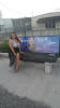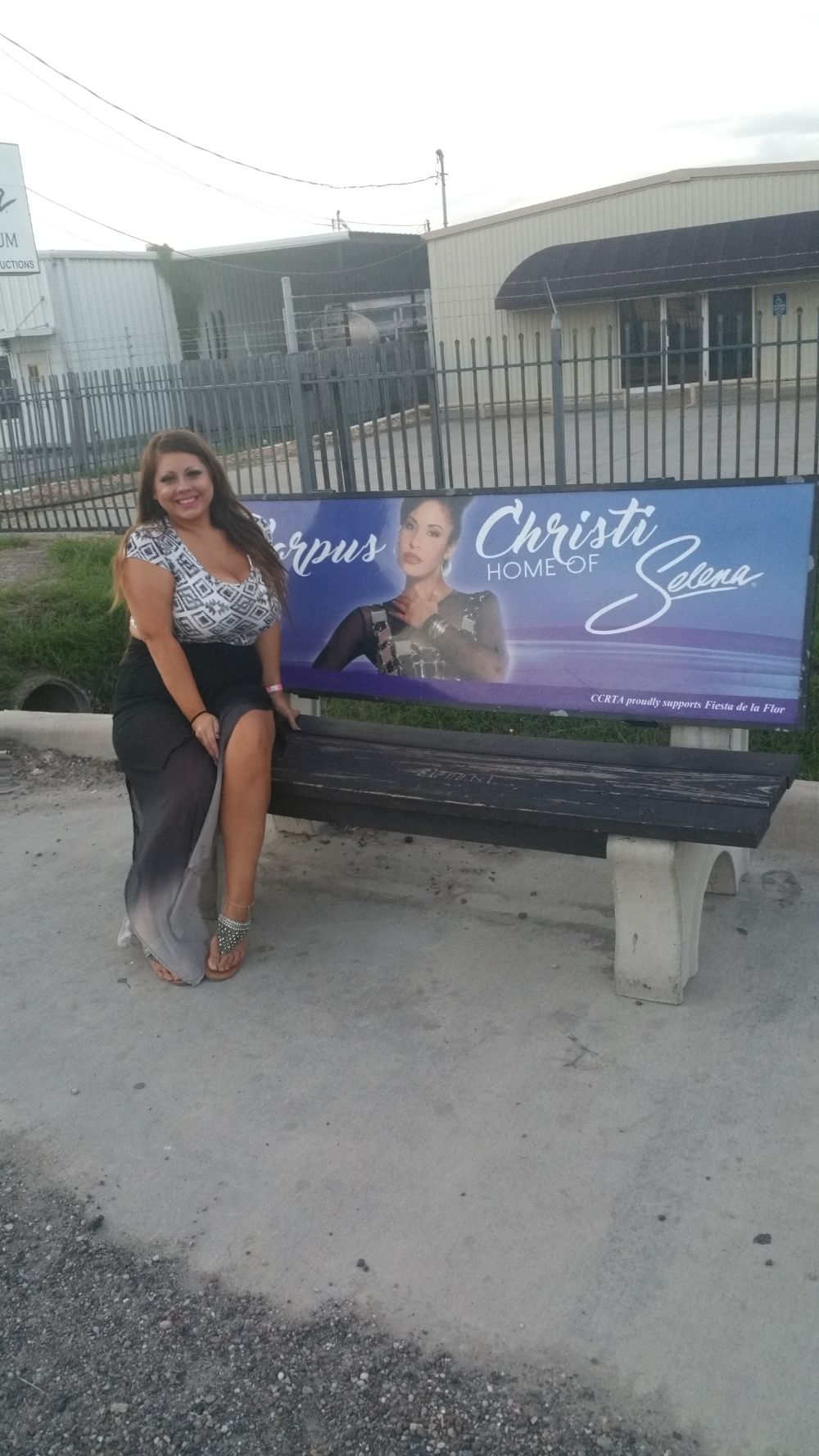 took a picture by the bus stop in the front with a picture of Selena